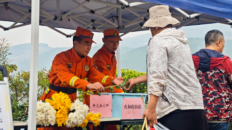 在普洱市思茅区,普洱消防救援机动支队联合应急、林草、民政等部门,在多个公墓入口设立志愿服务点,持续开展“鲜花换火种、鲜花换祭品”活动。当地已连续7年开展该项活动,敬献鲜花、植树追思、踏青遥祭等绿色祭扫方式正逐渐成为当地群众的祭扫新风尚。