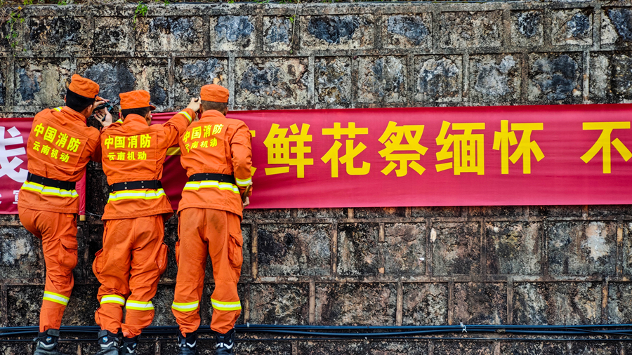 在普洱市思茅区,消防员在张贴标语(4月2日摄)。郭元丰 摄