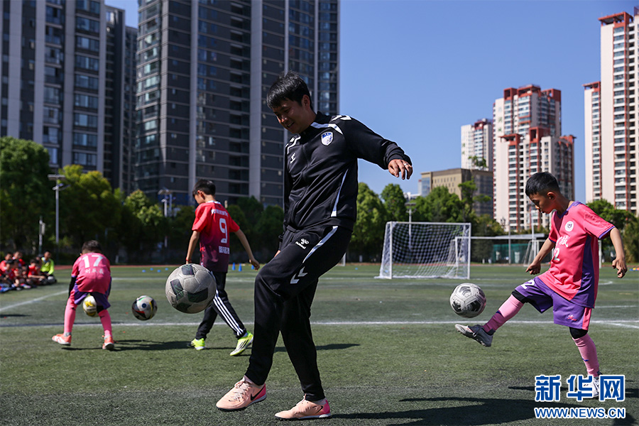 昆明队球员沈辑星与小学生展开“颠球比赛”(4月3日摄)。新华网发(杨桢宇 摄)