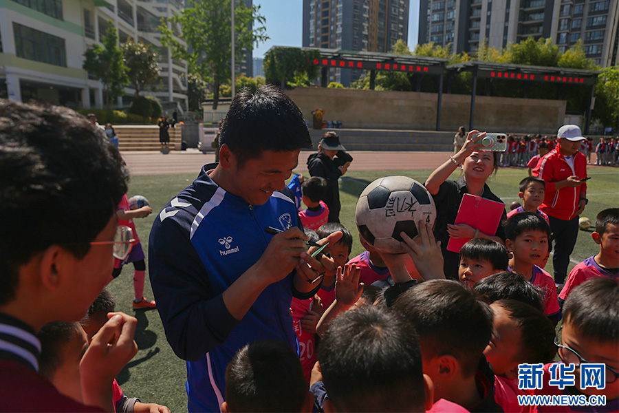 昆明队球员和磊为学生签名(4月3日摄)。新华网发(杨桢宇 摄)