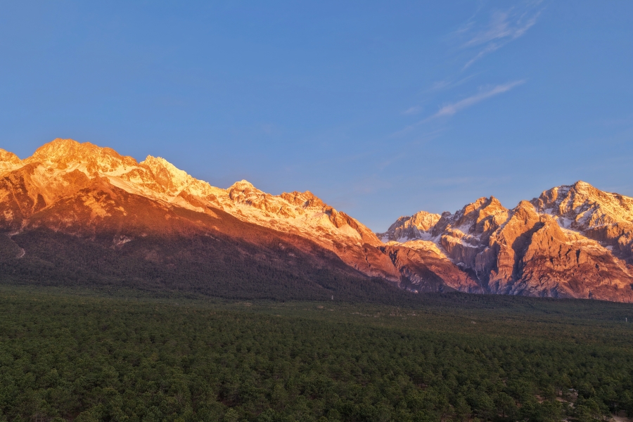 4月3日,云南省丽江市玉龙雪山出现日照金山景观。朝阳映照雪峰,气势雄伟,吸引不少游客与市民前来观赏,成为丽江春日一道亮丽风景。(完)