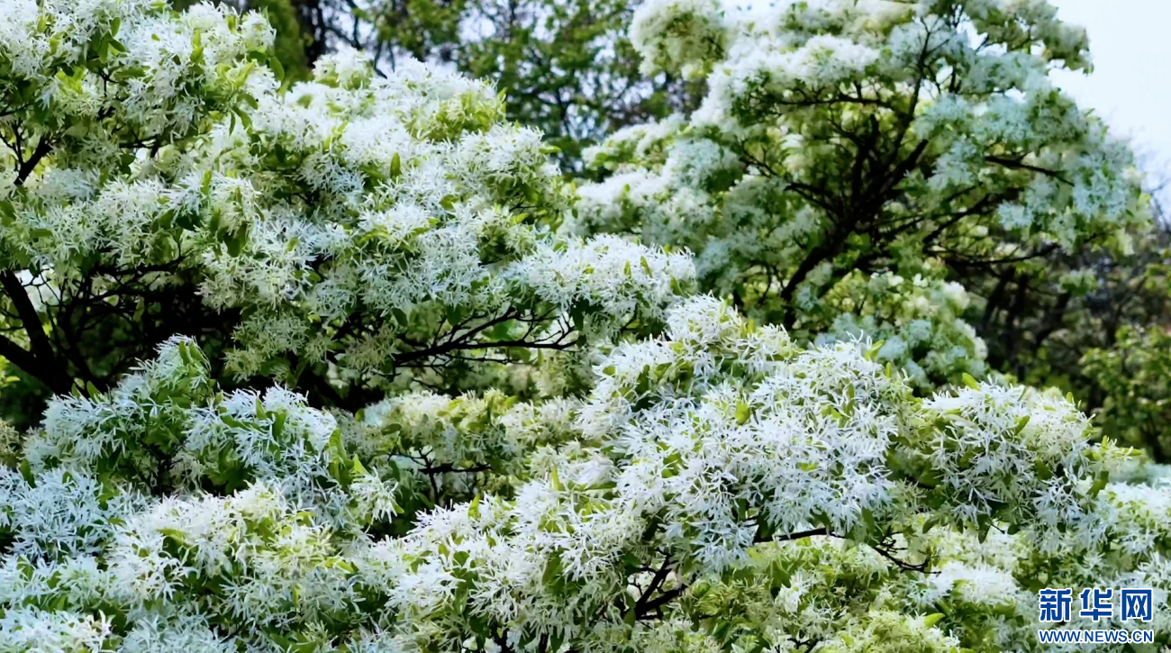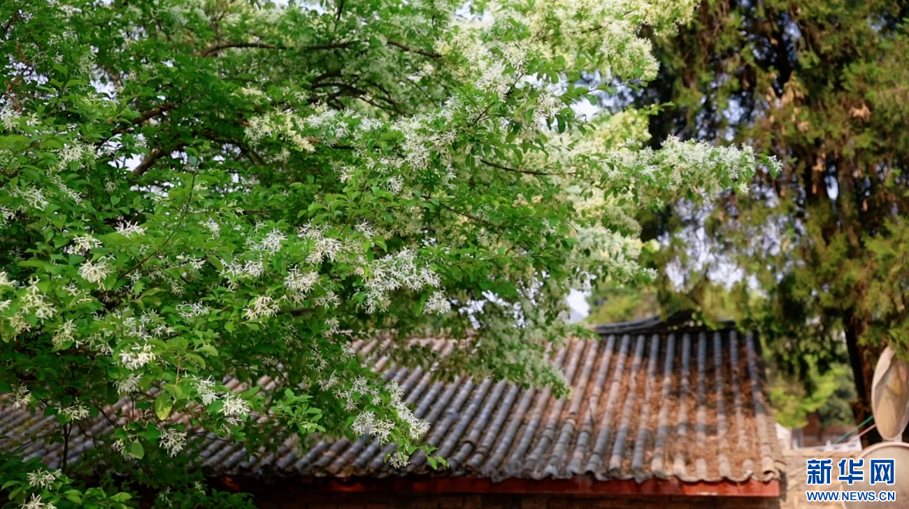 云南石林糯黑村,流苏古树冠盖如云,满树繁花悄然绽放(视频截图)。新华网发