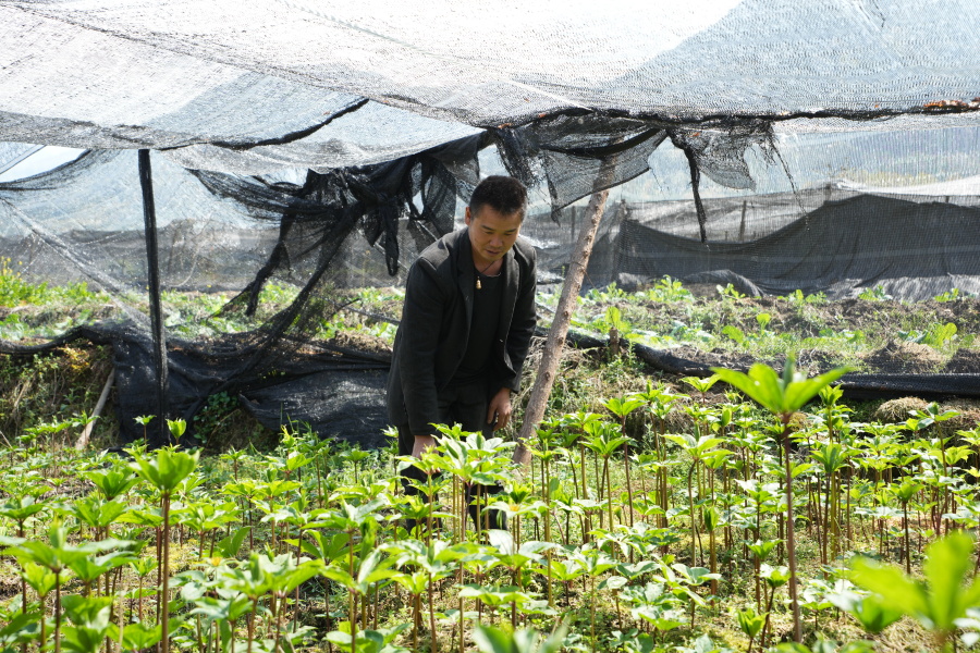 李曰刘查看重楼长势(3月20日摄)。