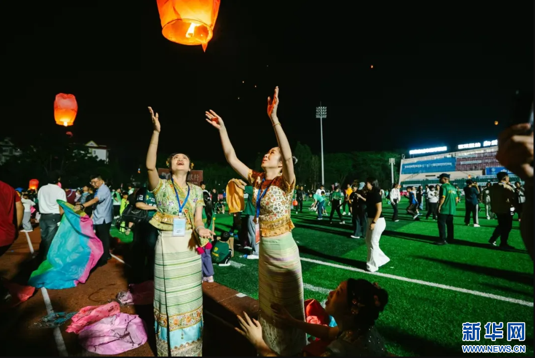 赛后,球迷在赛场放飞孔明灯(4月11日摄)。新华网发(勐腊发布 供图)