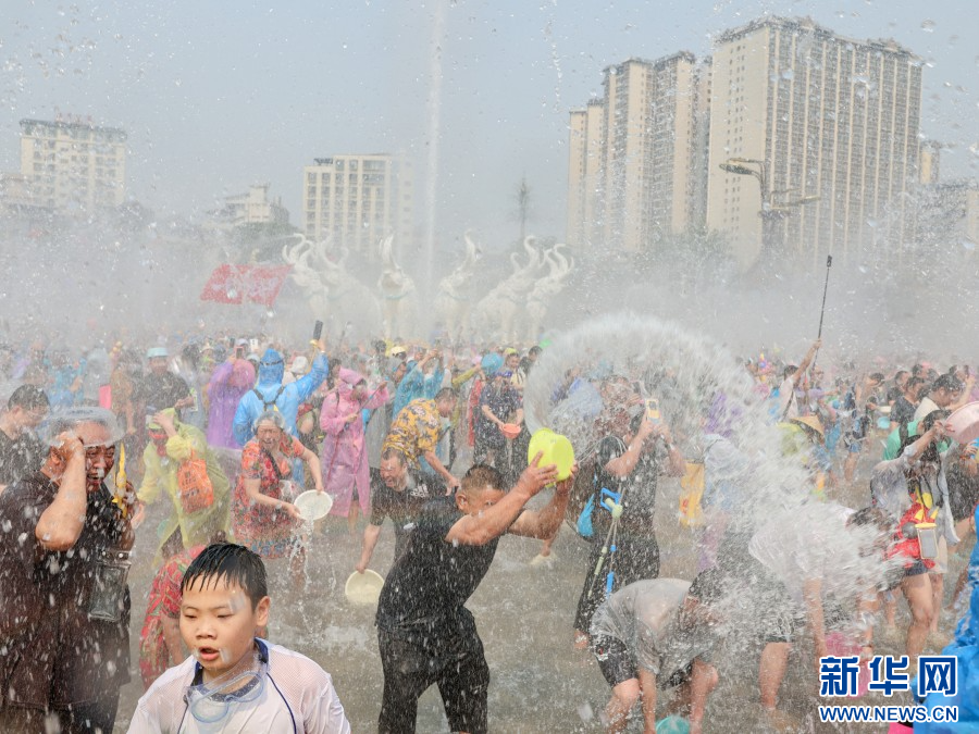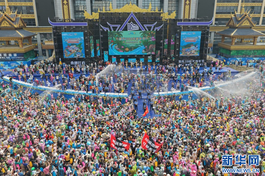 4月15日,云南省西双版纳傣族自治州万人泼水狂欢盛大启幕。市民、游客欢聚泼水广场,水花漫天飞舞,欢声此起彼伏,大家手持水盆、水枪尽情泼洒,互送祝福。(完)