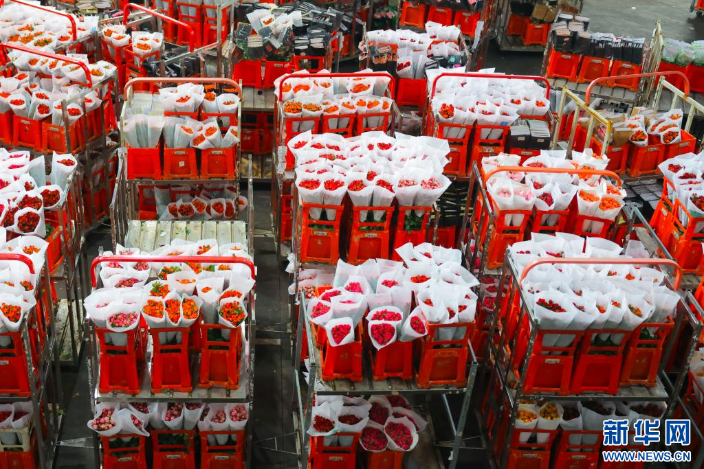 昆明国际花卉拍卖交易中心等待拍卖的鲜花。