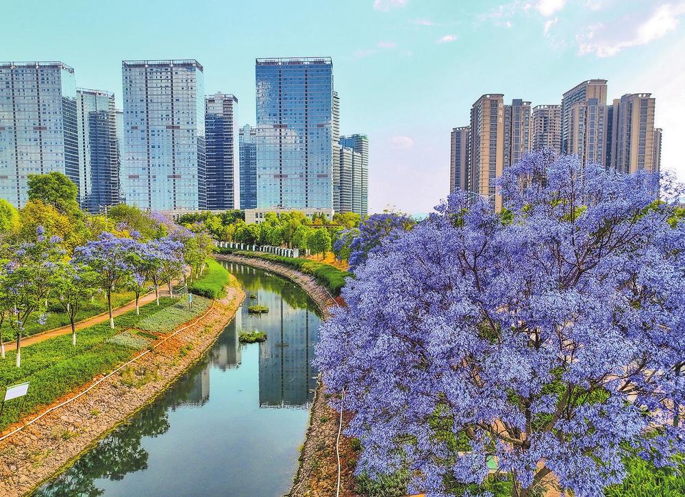 又是一年春深时,蓝花楹如约盛放,为春城昆明披上一层梦幻的蓝紫色。春城路浮雕墙前,低垂的花枝触手可及;福发路上,红色三角梅与紫色蓝花楹热烈同框;季官路两侧枝叶交叠,形成静谧的紫色隧道;滇池国际会展中心旁,新小清河边绵延两三公里的蓝花楹依水而生。无须远行,市民游客便可觅这份触手可及的春日美景。记者 张雁群 通讯员 郭武辉 摄