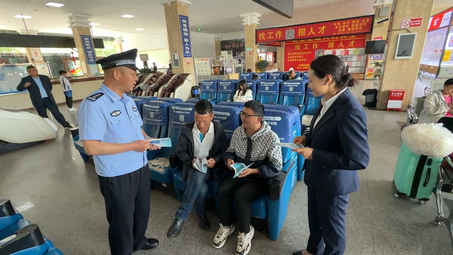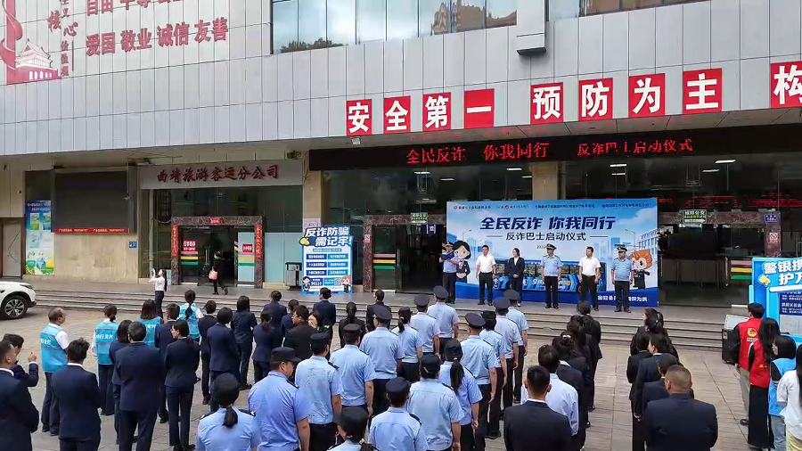 本次活动由曲靖市公安局麒麟分局、曲靖市商业银行股份有限公司、云南曲靖交通集团有限公司高快汽车客运站、曲靖靖源公共汽车有限责任公司联合主办。活动现场,公安、银行、交通等单位代表着装统一、整齐列队,与社区居民代表、往来群众共同参与。现场还设置了咨询台、宣传展板,工作人员向市民发放反诈宣传手册,指导群众下载注册“国家反诈中心”App。