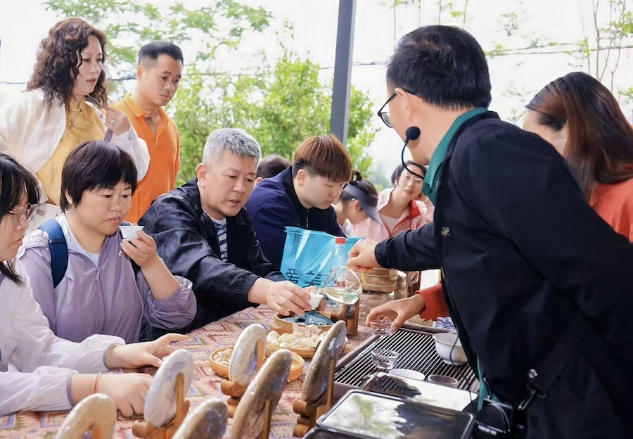 活动人员品尝鲜茶(4月23日摄)。