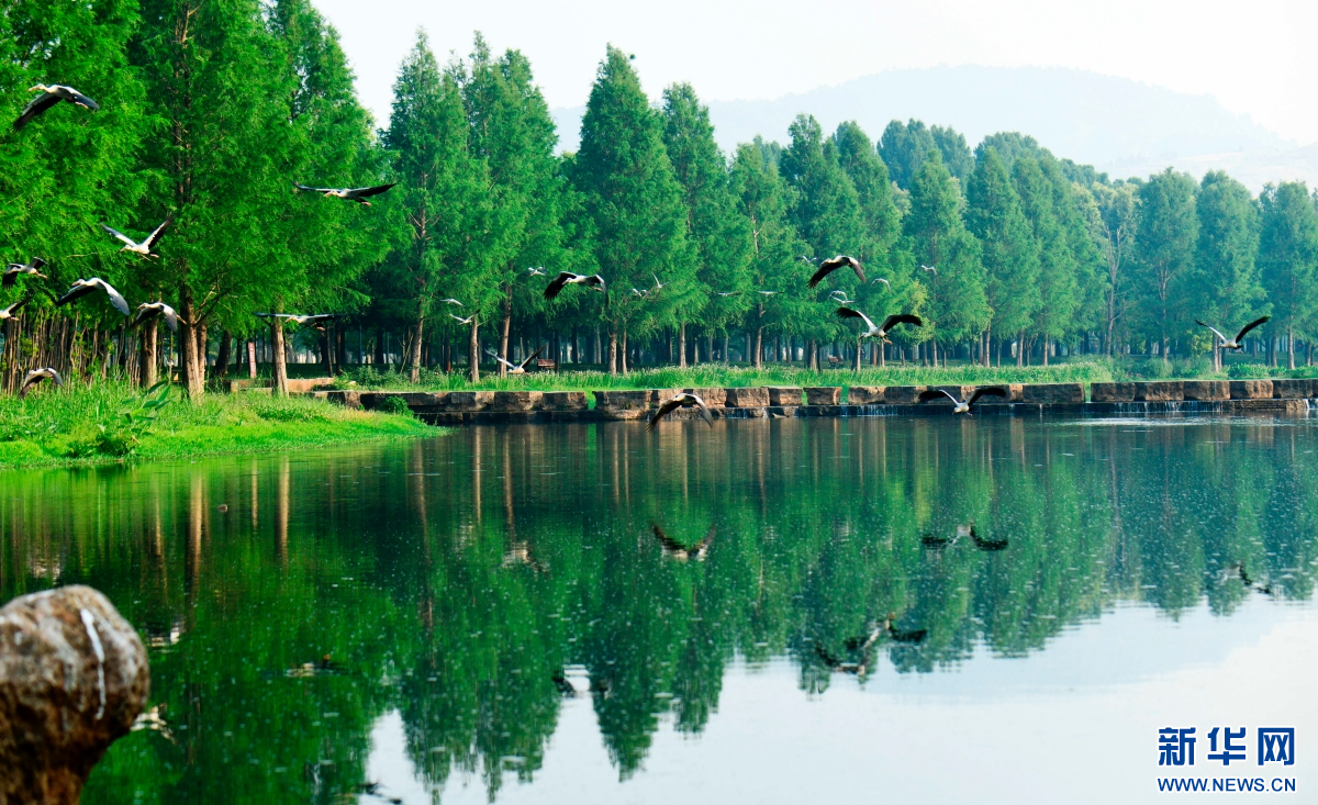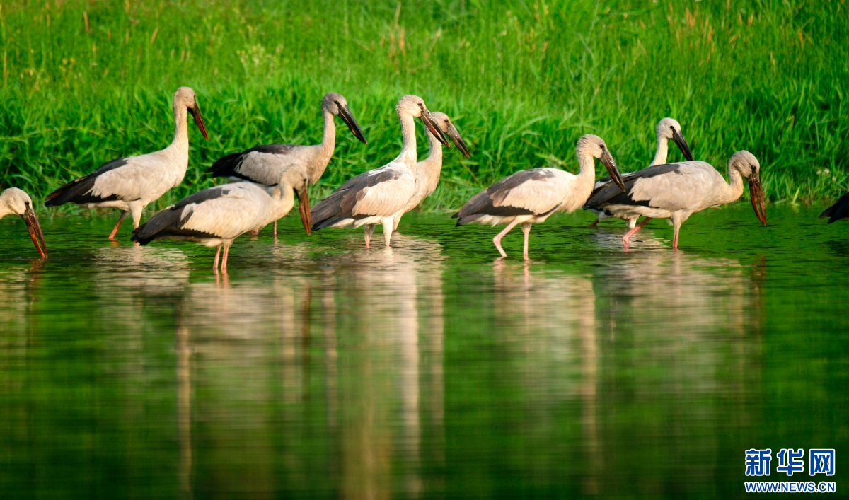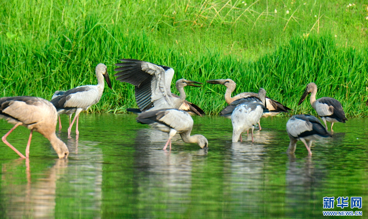 云南省红河哈尼族彝族自治州弥勒市甸溪河湿地公园,绿意盎然,满目苍翠,风光旖旎。成群钳嘴鹳前来觅食嬉戏、翩然起舞,灵动身影点缀河畔。近年来,弥勒市持续加强甸溪河生态管护,水域环境不断优化,优良的自然环境吸引众多鸟类到此栖息繁衍,绿水青山相映成趣,也让市民游客尽享生态之美。(普佳勇)