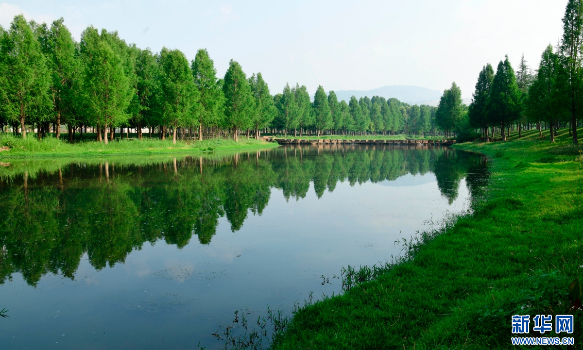 云南省弥勒市甸溪河湿地公园绿意盎然,风光旖旎(4月21日摄)。新华网发(普佳勇 摄)