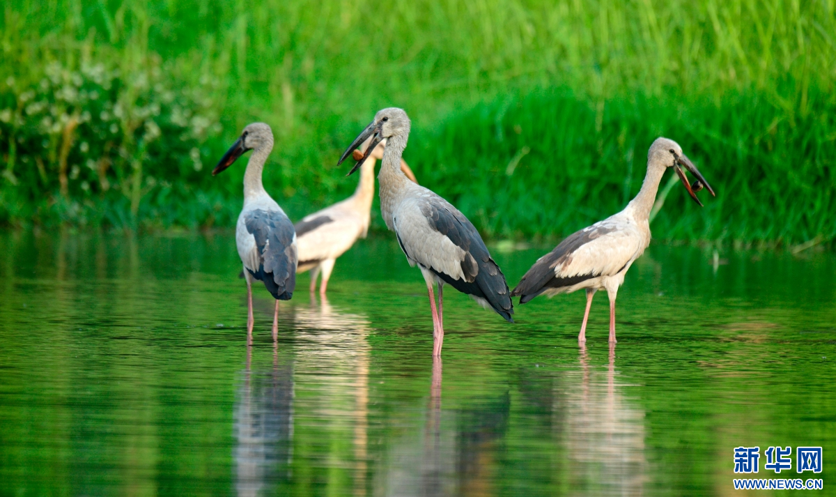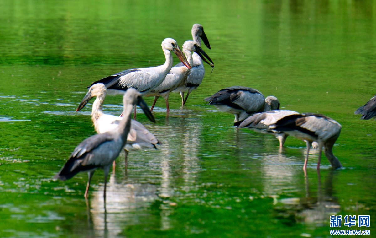 云南省弥勒市甸溪河湿地公园,钳嘴鹳觅食嬉戏(4月21日摄)。新华网发(普佳勇 摄)