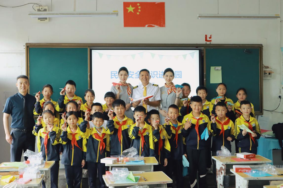 祥鹏航空“星火志愿机组”为山区孩子开设“民航知识小课堂”(2022年8月16日摄)。 祥鹏航空 供图