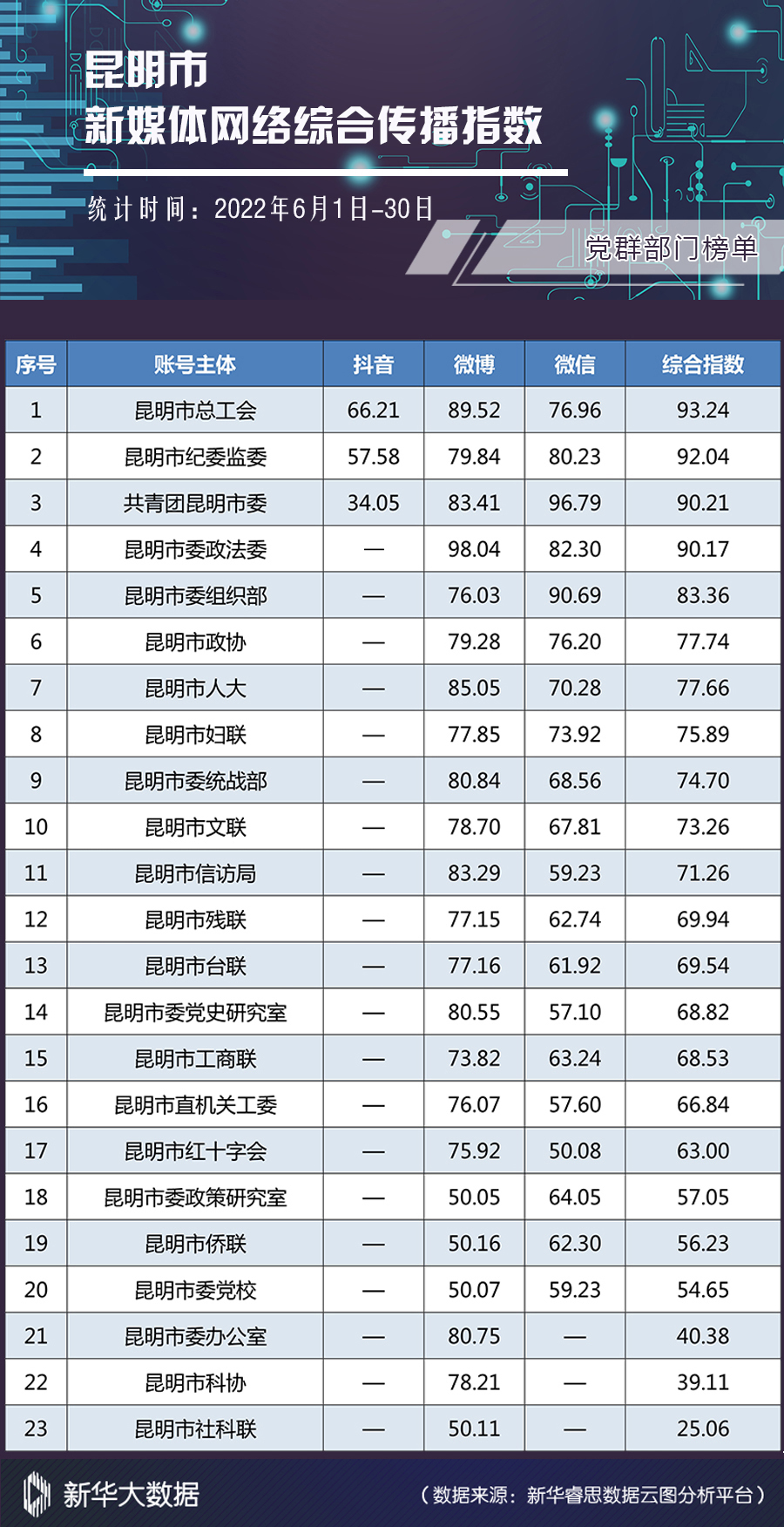 在榜单中,各部门名次无较大变化。微博平台中,昆明市委政法委、昆明市总工会、昆明市人大排名前三,其中昆明市人大在网络互动的三个指标中提升明显,仅次于昆明市委政法委;昆明市社科联、昆明市委党校、昆明市侨联、昆明市委政策研究室4家单位6月未发布任何信息,沦为“僵尸”账号。在微信平台,共青团昆明市委月度阅读量超过24万次,昆明市委政法委、昆明市纪委监委、昆明市委组织部月度阅读量也超10万次。