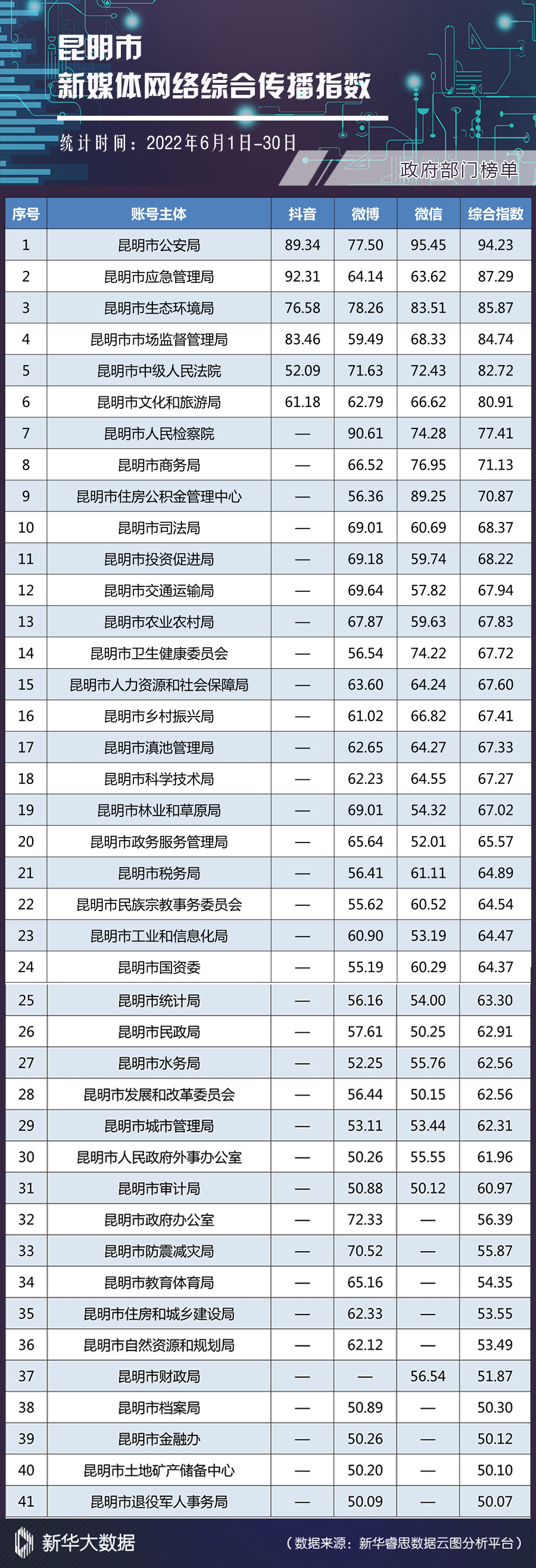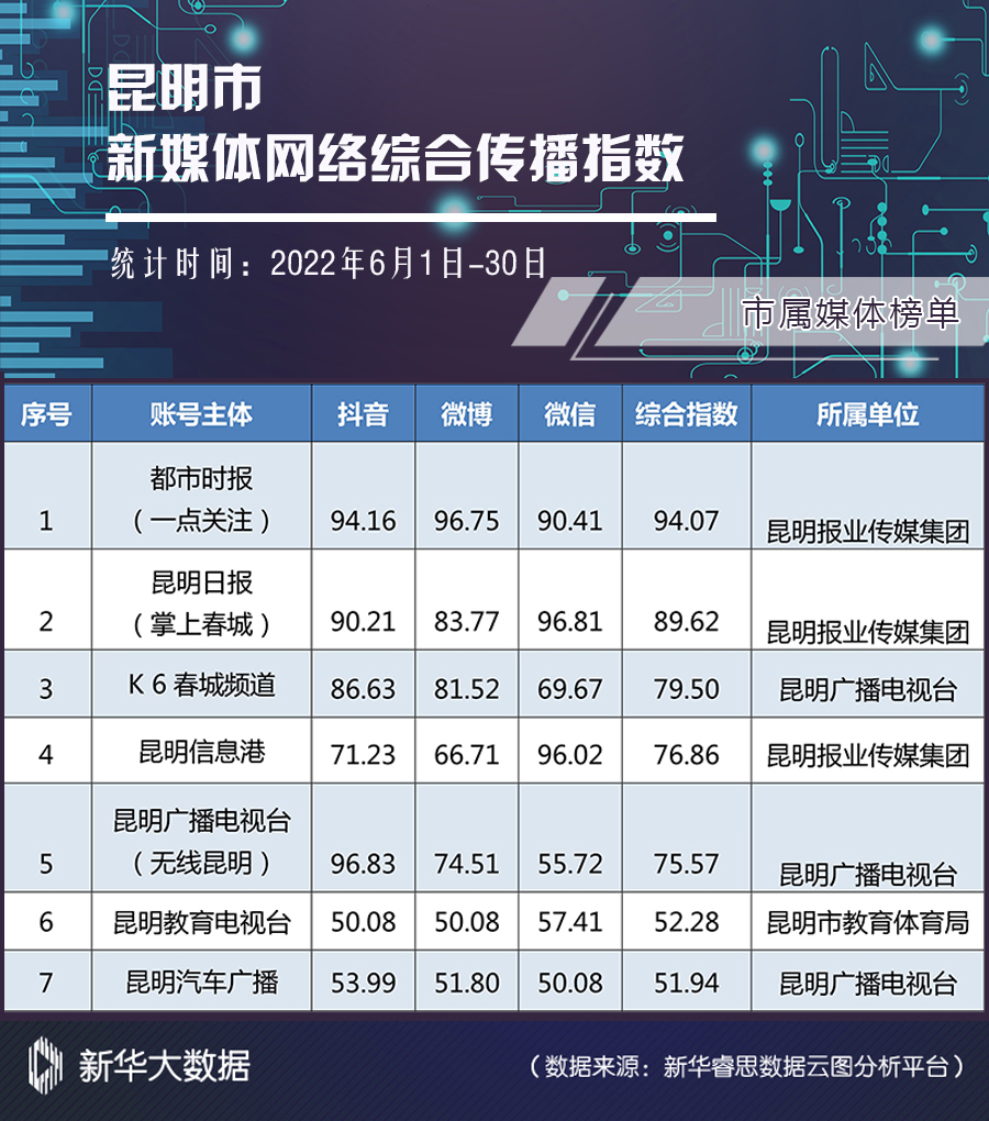 榜单由昆明市委网信办指导,昆明市网络文化协会发布。榜单依托新华大数据分析系统,从账号活跃度、内容创新力、账号互动性、传播扩散力四个维度对各单位(组织)认证的官方新媒体进行综合全面分析,客观反映昆明市新媒体网络综合传播力和影响力。(完)