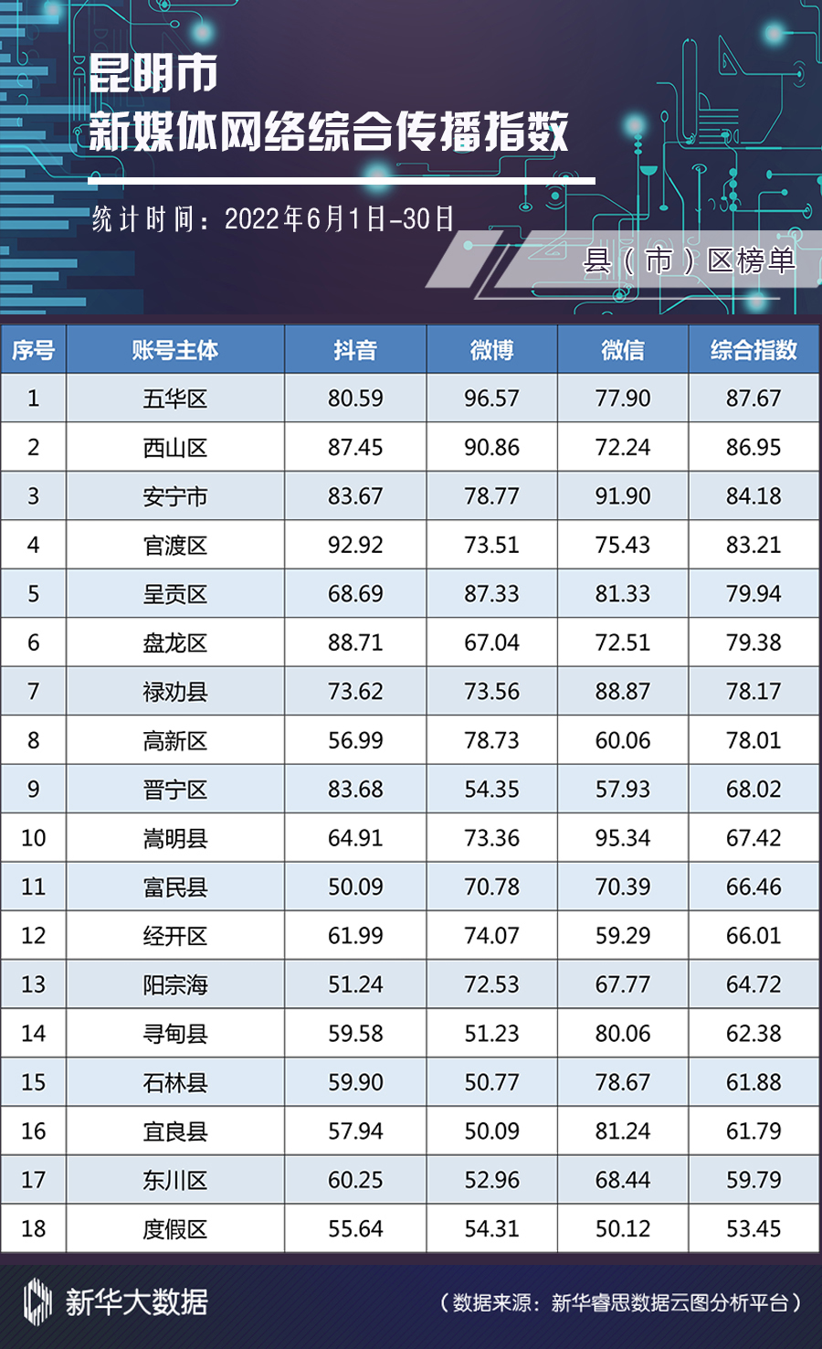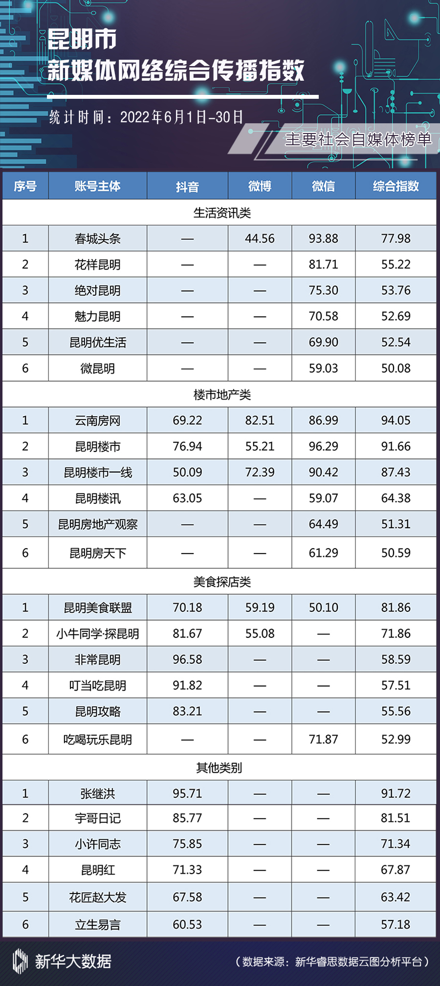 新华网昆明7月27日电(刘奕)日前,2022年6月昆明市新媒体网络综合传播指数榜单(以下简称“榜单”)发布。各部门、单位新媒体平台运维有序,但在“县(市)区”榜单中,个别县(市)区抖音成为内容二次转发平台,内容无原创、无策划。