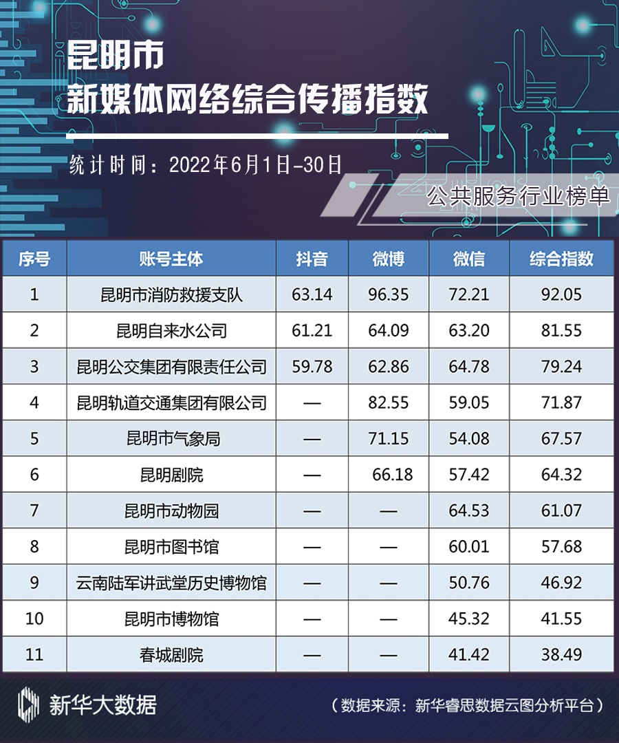 在榜单中,昆明自来水集团有限公司抖音转化率最高,7条作品获评论405条;昆明市消防救援支队在作品数、分享量、获赞量指标中都排名首位。在微博平台中,昆明市消防救援支队在信息发布和网络互动的5个指标中继续排名第一。微信平台中,昆明轨道交通集团有限公司和昆明市动物园分别产生两条爆款,《昆明市轨道交通5号线开通初期运营公告》和《百年圆通山 不只是座山》,前者是6月昆明的热点事件,作为第一信息源,内容得到网友、媒体、自媒体的阅读、分享和转载;后者配以老照片,对圆通山的历史变迁进行了详细介绍,从情感共鸣上引发网友的关注和分享。