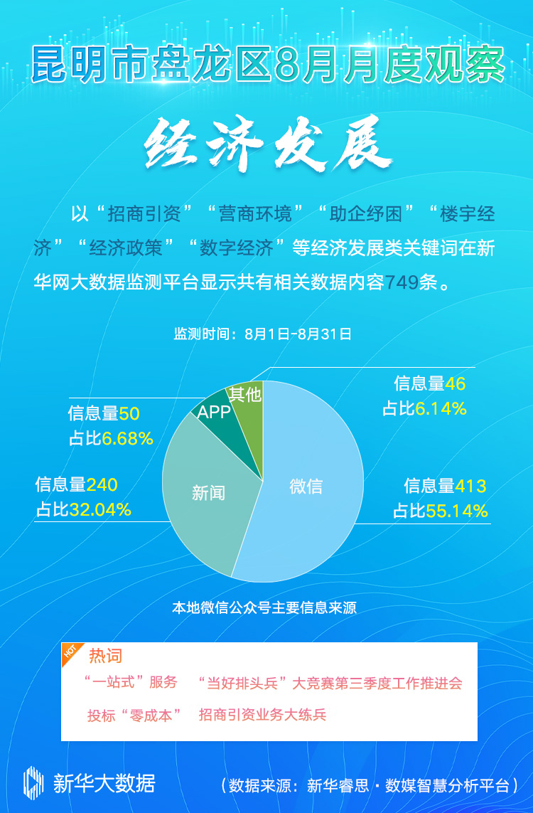 在“经济发展”主题中,以“招商引资”“营商环境”“助企纾困”“楼宇经济”“经济政策”“数字经济”等关键词在新华网大数据平台进行综合搜索、整理、分析、研判,共梳理出有效传播数据内容749条,较7月增加237条。其中,“一站式”服务、“当好排头兵”大竞赛第三季度工作推进会、投标“零成本”、招商引资业务大练兵成为当月全国媒体关注的盘龙区热词。