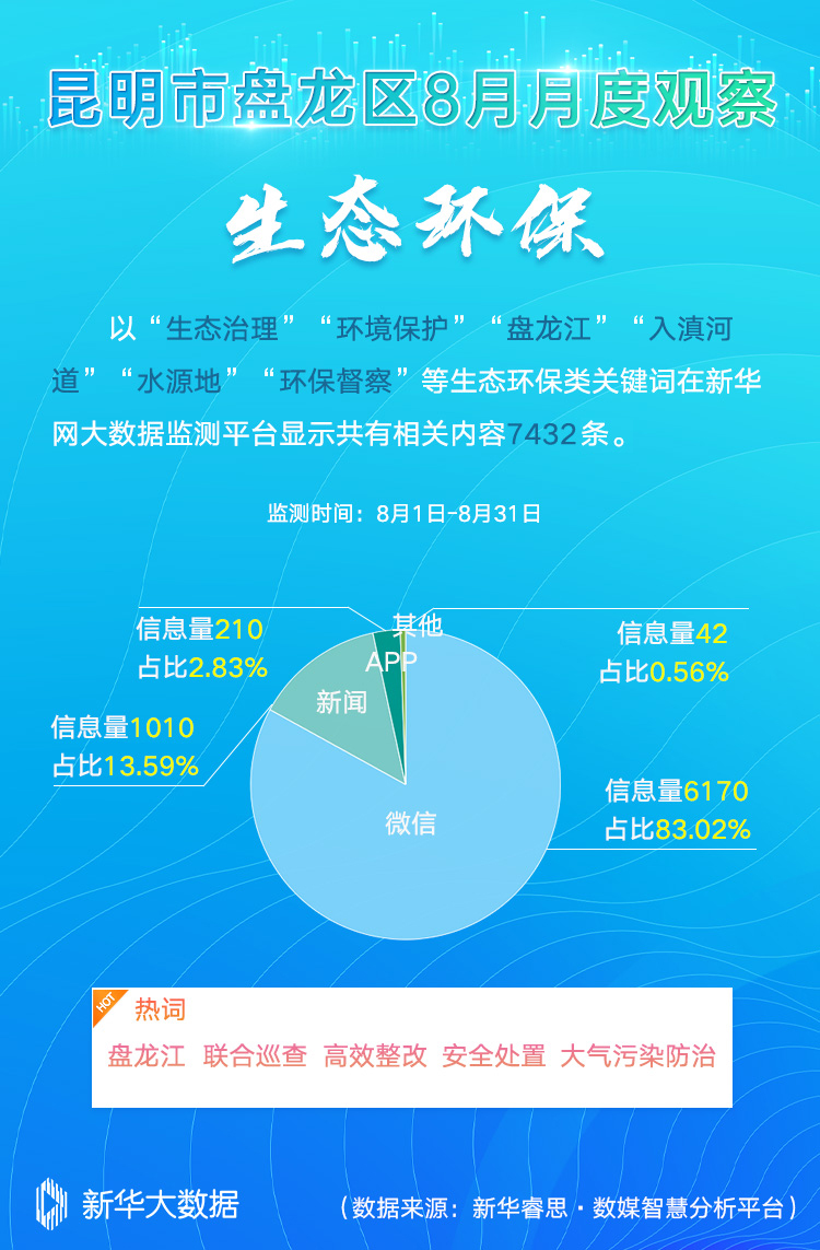 在“生态环保”主题中,以“生态治理”“环境保护”“盘龙江”“入滇河道”“水源地”“环保督察”等关键词在新华网大数据平台进行综合搜索、整理、分析、研判,共梳理出有效传播数据内容7432条,其中,盘龙江、联合巡查、高效整改、安全处置、大气污染防治等成为媒体关注热词。