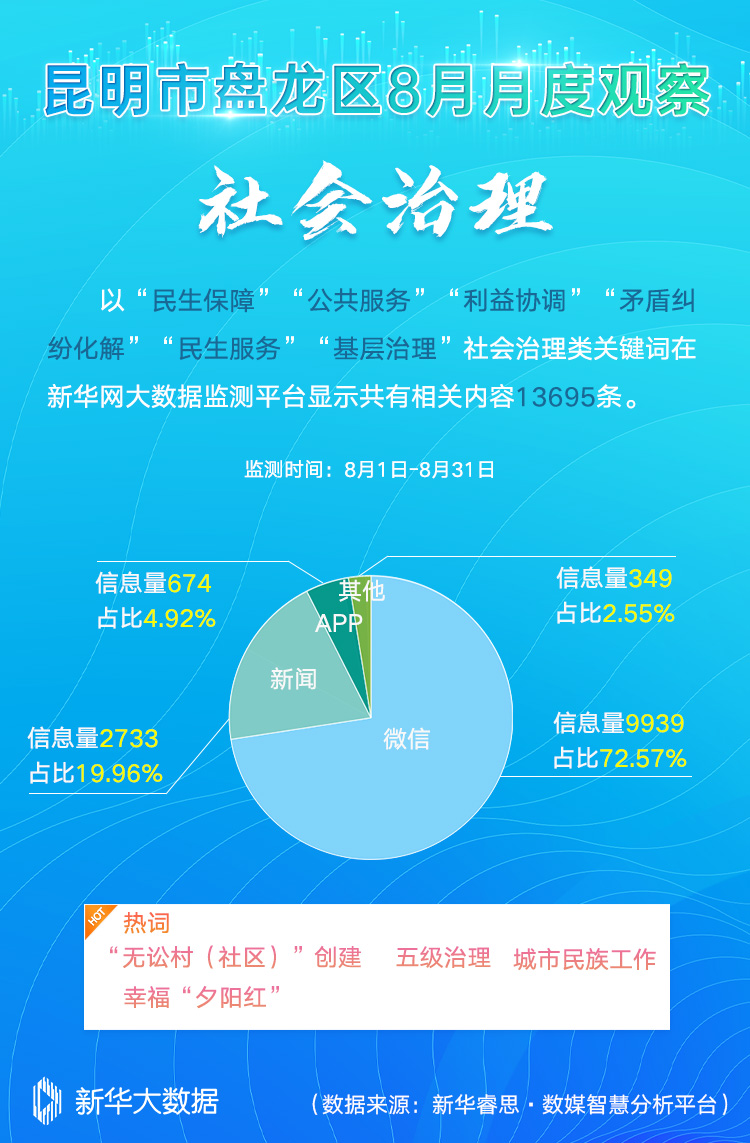 在“社会治理”主题中,以“民生保障”“公共服务”“利益协调”“矛盾纠纷化解”“民生服务”“基层治理”等关键词在新华网大数据监测平台进行综合搜索、整理、分析、研判,共梳理出有效传播数据内容13695条,较7月增加2268条,其中,“无讼村(社区)”创建、五级治理、城市民族工作、幸福“夕阳红”等成为媒体关注的热词。