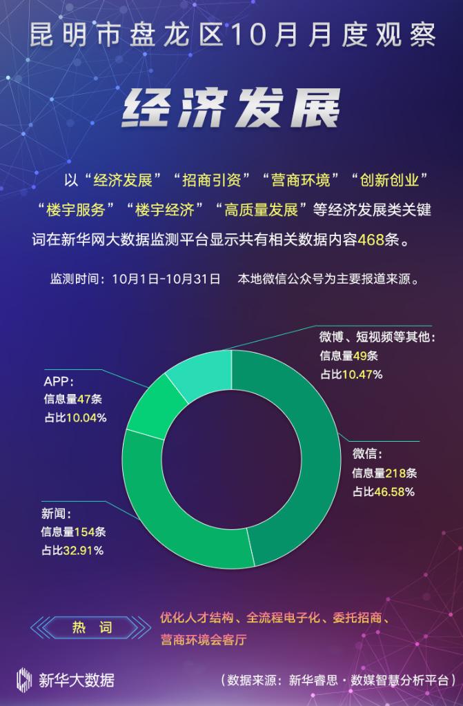 在“经济发展”主题中,以“经济发展”“招商引资”“营商环境”“创新创业”“楼宇服务”“楼宇经济”“高质量发展”等关键词在新华网大数据监测平台进行综合搜索、整理、分析、研判,共梳理出有效传播数据内容468条。其中,优化人才结构、全流程电子化、委托招商、营商环境会客厅成为当月全国媒体关注的盘龙区热词。