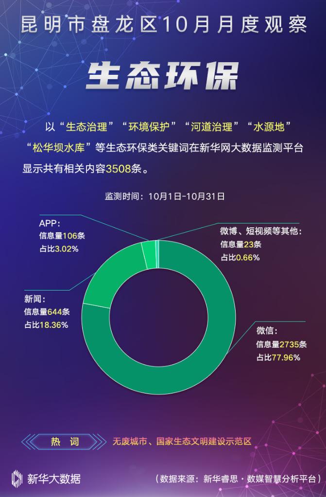 在“生态环保”主题中,以“生态治理”“环境保护”“河道治理”“水源地”“松华坝水库”等关键词在新华网大数据监测平台进行综合搜索、整理、分析、研判,共梳理出有效传播数据内容3508条。其中,无废城市、国家生态文明建设示范区等成为媒体关注热词。