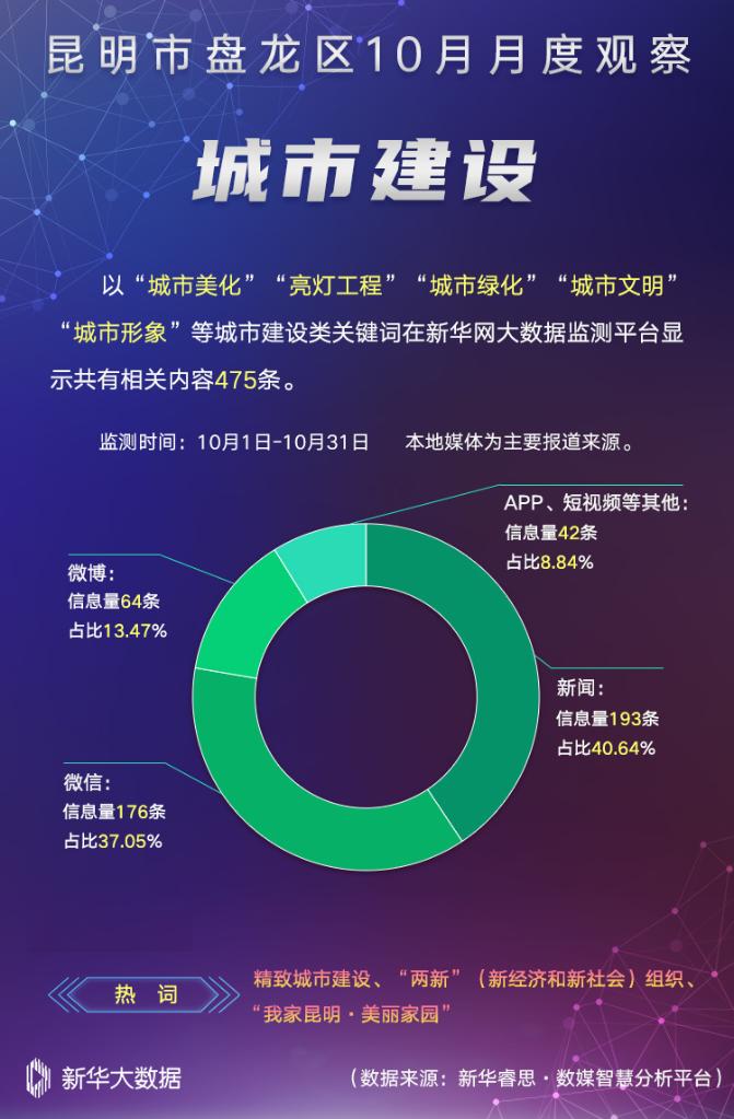 在“城市建设”主题中,以“城市美化”“亮灯工程”“城市绿化”“城市文明”“城市形象”等关键词在新华网大数据监测平台进行综合搜索、整理、分析、研判,共梳理出有效传播数据内容475条。其中,精致城市建设、“两新”(新经济和新社会)组织、“我家昆明·美丽家园”成为媒体关注热词。