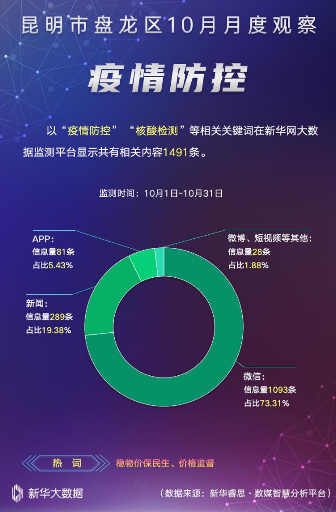 在“疫情防控”主题中,以“疫情防控”“核酸检测”等关键词在新华网大数据监测平台进行综合搜索、整理、分析、研判,共梳理出有效传播数据内容1491条。其中,稳物价保民生、价格监督等成为媒体关注热词。