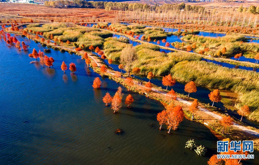 冬日,云南省大理白族自治州洱源县凤羽镇江登湿地,“水杉红”如期上线。航拍视角下,绯红的水杉如同朵朵烟花,在湖蓝色的水面上绽放开来,“杉”水相映,如诗如画,给冬日的洱海之源增添了生机与活力。