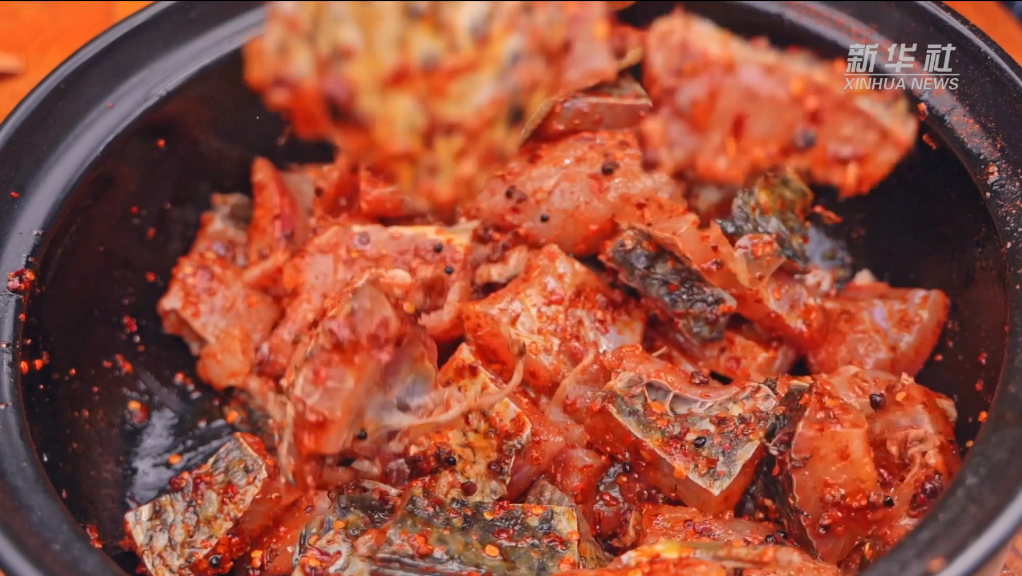丰收时节也是满足味蕾的时节。糟鱼是晋宁民间流传的一道美食,主要选用草鱼或鲤鱼为原料,配上辣椒、白酒、花椒、八角、香油等辅料,采用刮鳞剖鱼、洗鱼、切块、晾晒、糟制等十多道传统手工工序制作而成。