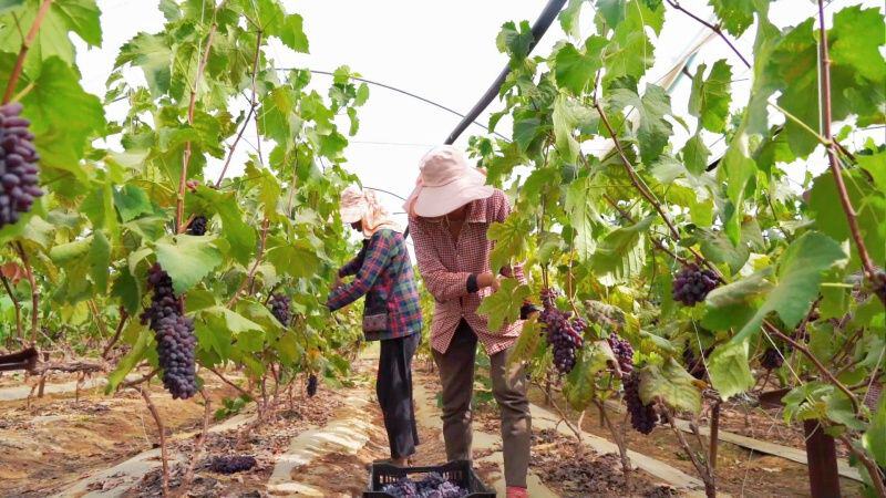 走进位于猛虎乡阿里地村委会的茉莉香葡萄种植基地,一串串紫红色的茉莉香葡萄挂满藤蔓,果香四溢。