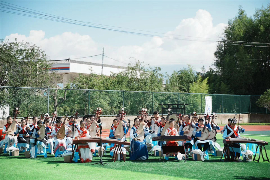 贝泰妮希望小学揭牌仪式上,贝泰妮非遗文化传承项目同时进行展演,来自海东完小、白沙完小、丽江市青少年宫的洞经古乐队、民歌合唱团、东巴舞团3支非遗传承队伍带来精彩节目。