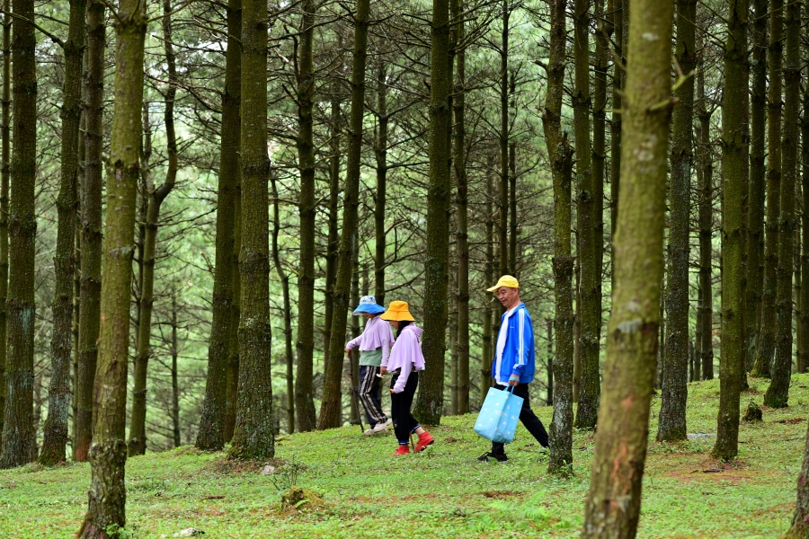 当地群众在万亩松林里捡拾野生菌(7月22日摄)。毛虹 摄