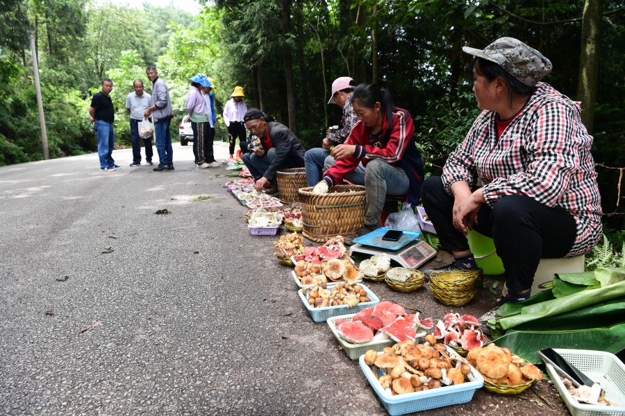 松林周边的村民在路边售卖野生菌(7月22日摄)。毛虹 摄