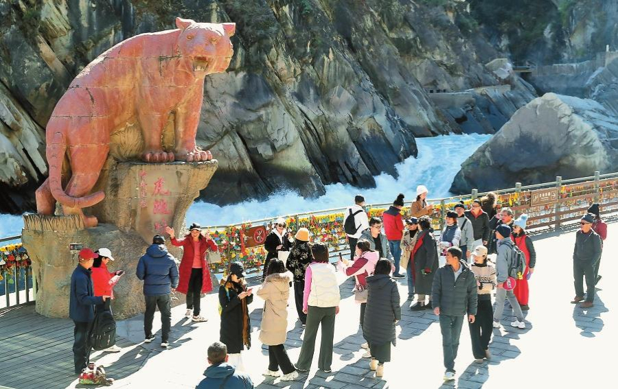 游客纷纷来到虎跳峡景区,欣赏壮观的金沙江大峡谷。 记者 杨峥 摄