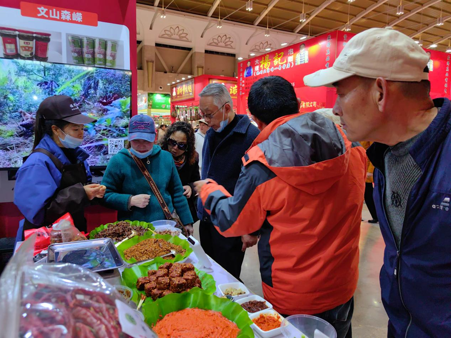 现场制作的手工酱料、具有云南特色的红果参、具有文山特色的秘制三七根下饭菜、非遗七彩花米饭、丘北辣椒制品、农家散养鸡、玫瑰花制品……在第十七届中国昆明新春购物博览会(以下简称“春博会”)期间,“康旅集团驻丘北县乡村振兴消费帮扶点”展位吸引了众多市民前来围观、购买。