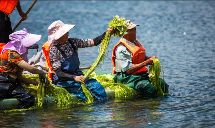 “花开水更好,水清花价高”,洱源县将人工种植海菜花作为重要的绿色生态产业进行扶持培育,实现环境保护与经济效益双赢,走出了一条生态与经济协同发展的新路径。截至2024年8月,洱源县共种植海菜花3000亩、年产量5400吨,带动158户种植户增收1080万元。