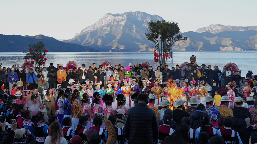 晚会尾声,甲搓舞音乐在泸沽湖畔响起,群众和游客手拉手,跳起民族团结舞,欢欢喜喜过大年。(完)(曹勇 杨永琼 朱晓龙 阿说古旺)