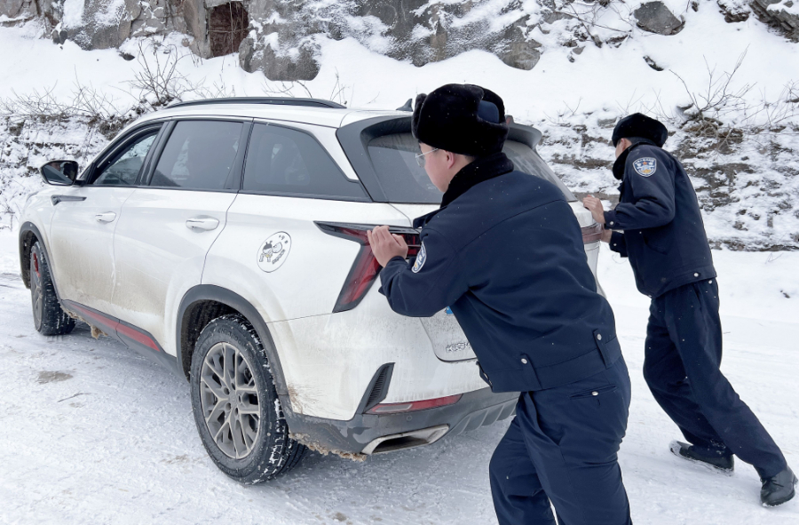 实施温情救助,为打滑车辆增加助力。一路冰雪,一路情。冰雪天气易出现车辆打滑、侧翻、陷入侧沟等,为让车辆安全通过冰雪路面,让受困车辆脱困,永善警方采取警车开道,一路随行,执勤民警辅警则与驾乘人员一起推车,让群众在严寒中感受到了温情。