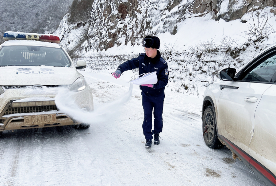 抛洒工业盐融冰化雪,保障道路畅通。当天一早,高海拔区域的绝大部分道路被冰雪覆盖后,永善交警联合辖区派出所民警辅警纷纷上路,对冰雪严重路段抛洒工业盐融化冰雪,竭力做到不让一辆车、一名旅客因冰雪阻挡而滞留在回家路上。