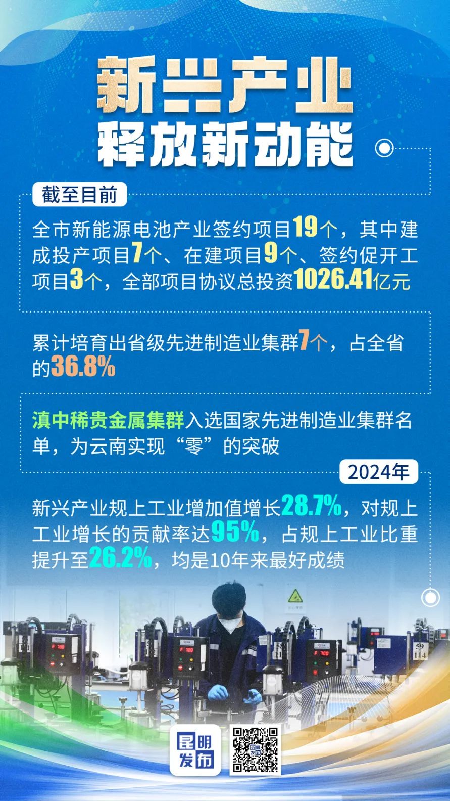 昆明市围绕新能源电池、新材料、生物医药、电子信息、先进装备制造等新兴产业,积极开展补链延链强链,推动千亿级产业集群加速形成。累计培育出省级先进制造业集群7个,占全省的36.8%。滇中稀贵金属集群入选国家先进制造业集群名单,为云南实现“零”的突破。2024年,新兴产业规上工业增加值增长28.7%,对规上工业增长的贡献率达95%,占规上工业比重提升至26.2%,均是10年来最好成绩。
