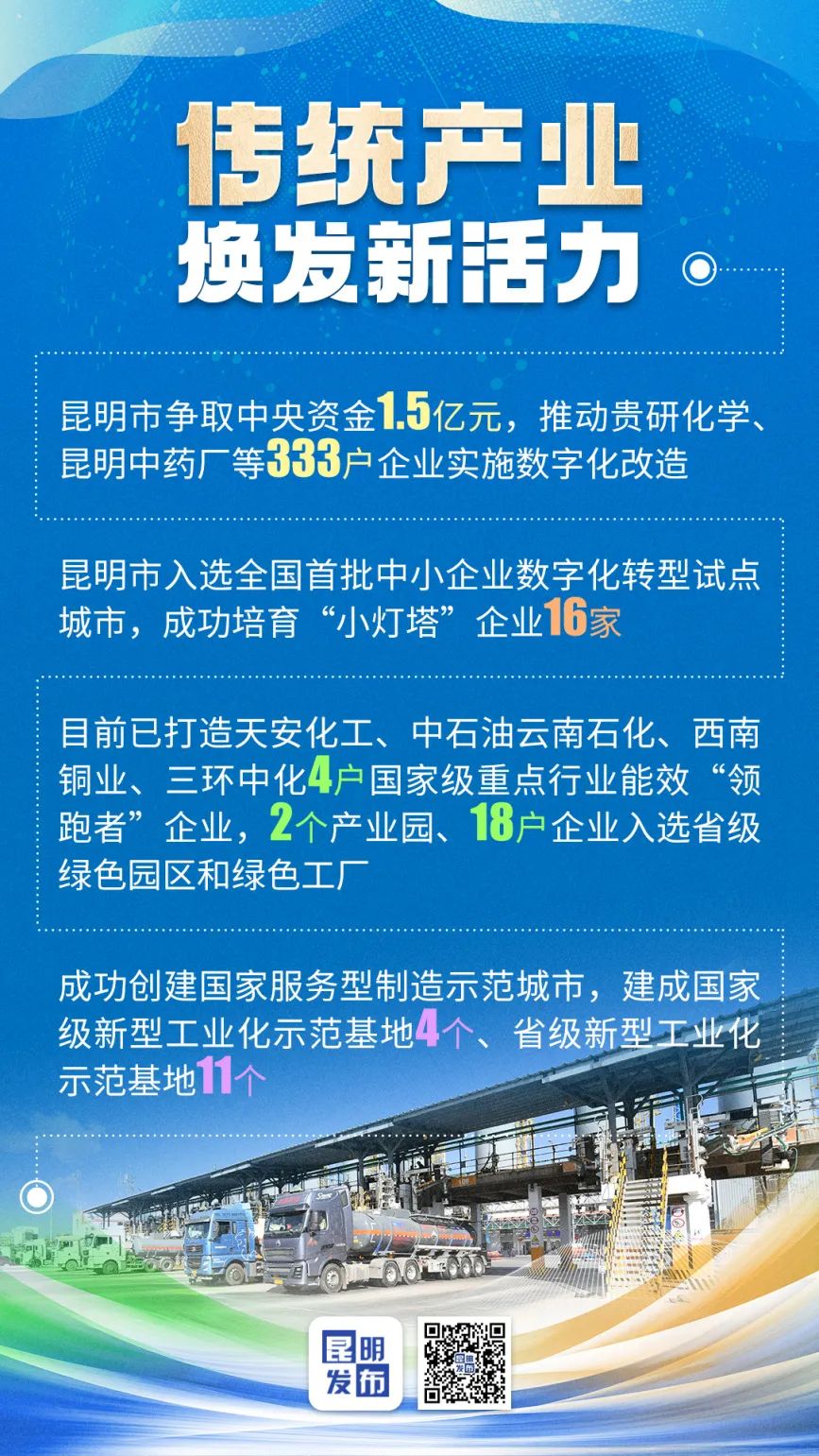 在加快传统产业数字化转型方面,昆明市争取中央资金1.5亿元,推动贵研化学、昆明中药厂等333户企业实施数字化改造。昆明市入选全国首批中小企业数字化转型试点城市,成功培育“小灯塔”企业16家,昆钢工业互联网平台达到国内先进水平,昆明卷烟工商物流一体化领先行业水平。