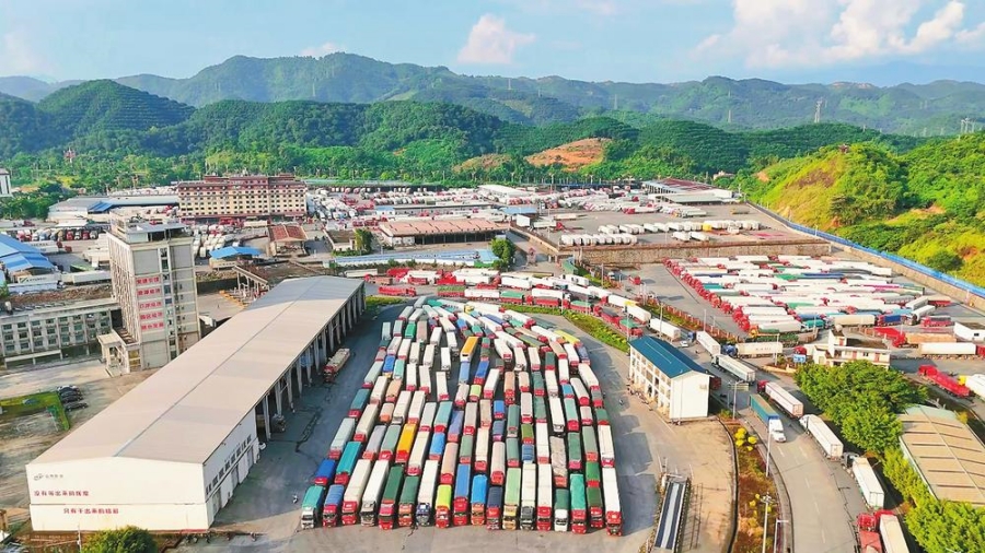 车辆在河口口岸北山国际货场等待出关。