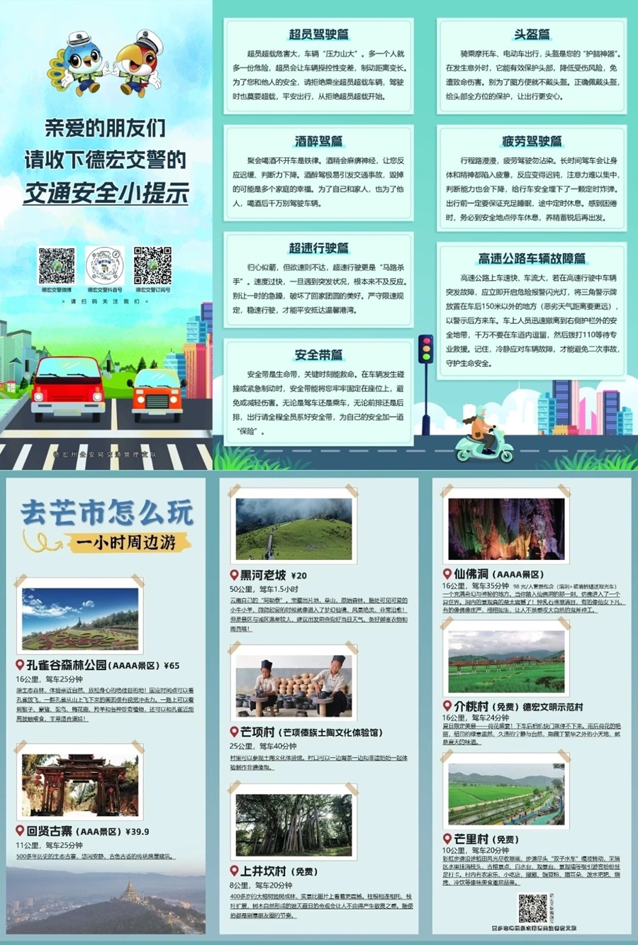 芒市交管大队在高速入口,“勐焕金银塔”、傣族古镇、孔雀谷等景区以及车站等地向游客免费发放“旅游攻略+交通知识”宣传折页。截至目前,芒市交管大队共发放“旅游攻略+交通知识”宣传折页5万份,用心用情织密芒市旅游“平安网”。