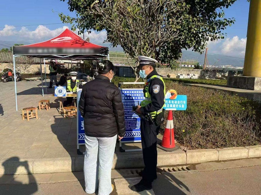 芒市交管大队对未佩戴安全头盔的驾驶人开展现场教育(1月5日摄)。