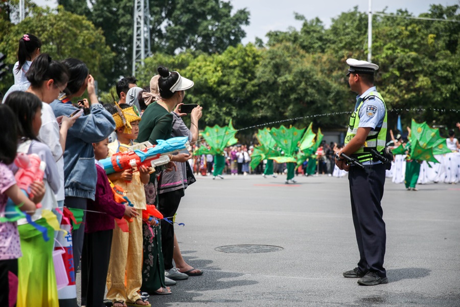 芒市交管大队在泼水节活动现场开展交通安保工作(4月12日摄)。