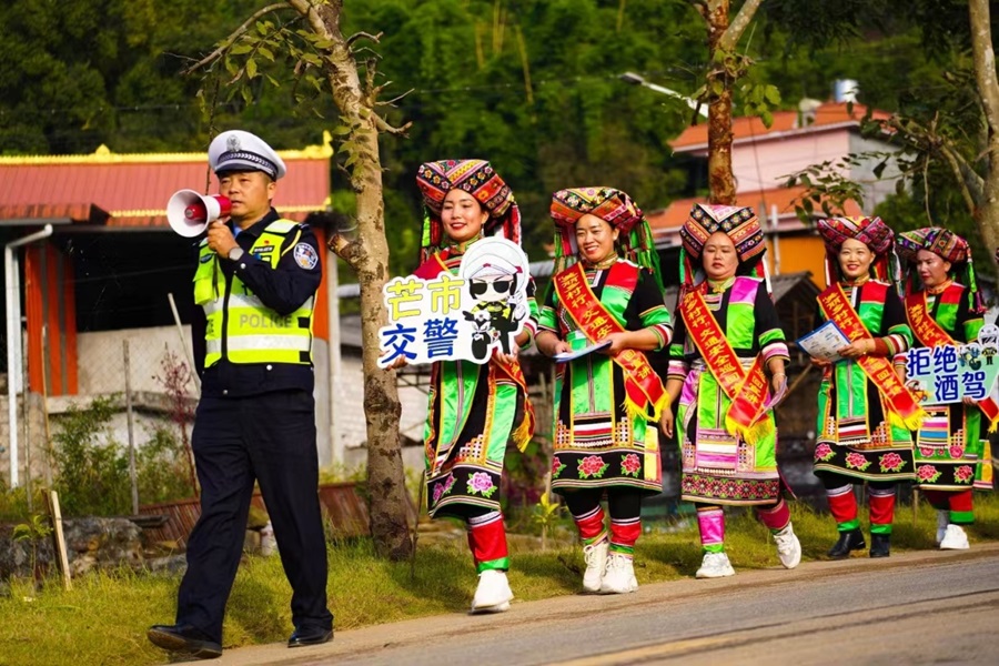 在芒市,汉族、傣族、景颇族、阿昌族、傈僳族、德昂族等群众在芒市和谐共处,根植于丰富多彩的民族文化沃土,芒市交管大队构建“双语宣传+民俗载体”的道路交通安全教育体系,实现“润物细无声”的传播效果。