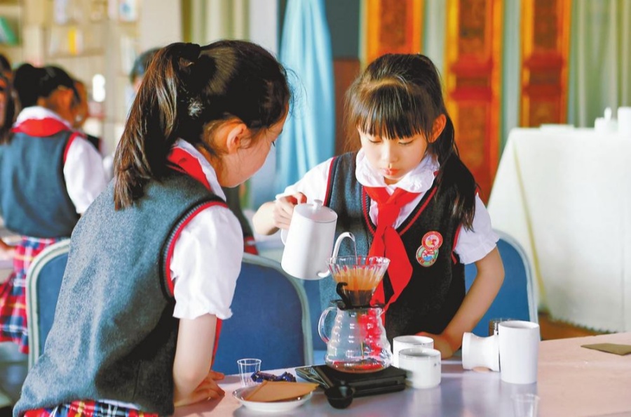 学生们体验手冲咖啡制作。(高吴双 摄)