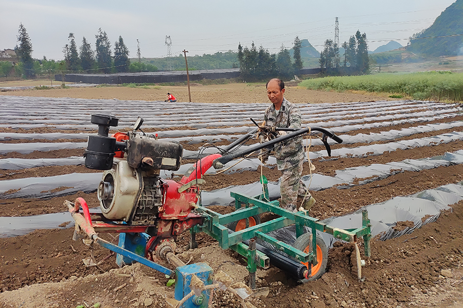 马白镇马鞍山烟农刘家富正在使用覆膜机覆膜(4月27日摄)。