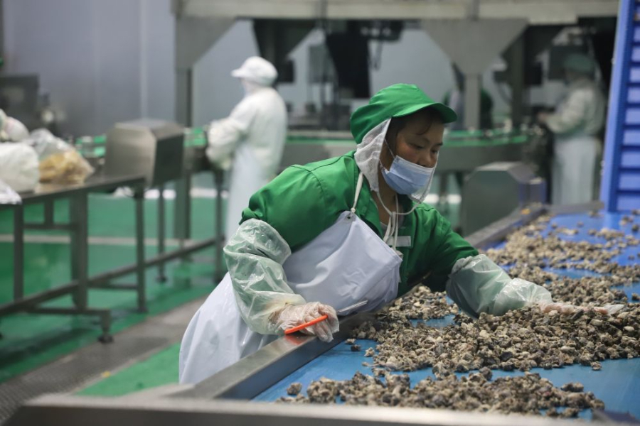 乌鸡屠宰加工厂内工人们正在制作乌骨鸡罐头(2025年5月7日摄)。